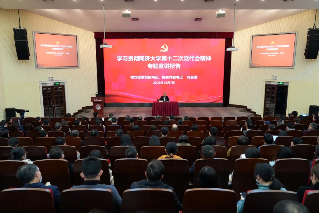 为深入学习宣传贯彻学校第十二次党代会精神,12月7日,机关党委举办学习贯彻开云kaiyun官方网站第十二次党代会精神专题报告会,校党委常务副书记、机关党委书记冯身洪应邀作专题报告。机关科级以上干部、各支部支委、党员代表、教职工代表、2023年度新上岗处级干部培训班成员、建筑与城市规划学院部分师生代表等300余人现场参加,机关其他党员、教职工通过线上方式聆听学习。