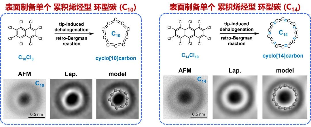 直到2019年,IBM实验室与牛津大学研究团队制备出单个的环型碳C18,首次从实验上验证了C18为单键和三键交替的聚炔型结构。然而,环型碳是一个大家族,对于更小的环型碳,它们的合成由于尺寸太小变得更具挑战性。此外,它们的结构和稳定性仍然让人难以捉摸。特殊的是,有理论预测C10是环型(n ≥ 10)和线型(n < 10)的分界点,同时也是最大的芳香性累积烯烃型环型碳。C14则被预测是从累积烯烃型C10到聚炔型C18的Peierls相变过渡态。因此,研究C10和C14的结构和稳定性具有极其重要的意义。只有将这2种全新的碳材料家族成员精准合成出来,方能精细表征它们的结构。