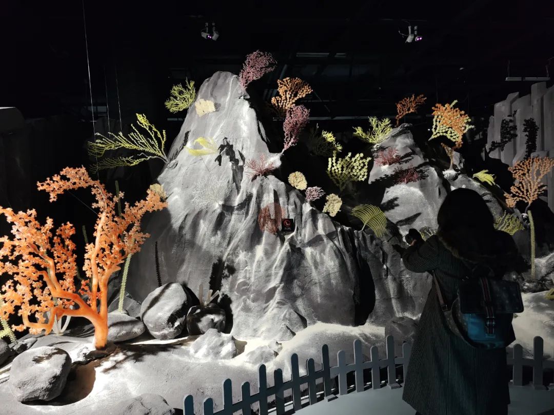 本次展览最大的亮点是拥有400平方米的深海场景,集冷水珊瑚、热液和冷泉三个生态系统于一体。通过3D建模、打印技术制作80株冷水珊瑚模型,还原了冷水珊瑚的自然生长状态,其中最大的近2米高,再加上管状蠕虫生物群的微缩模型和28平方米大型多媒体投影的应用,使得近景和远景相得益彰,给观众营造一种身临其境的视觉盛宴。