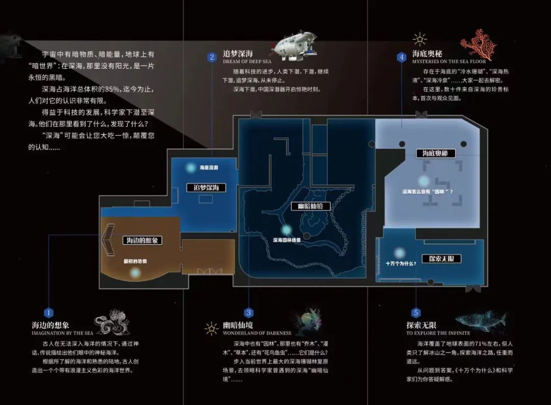 展览分为“海边的想象”“追梦深海”“幽暗仙境”“海底奥秘”“探索无限”五个版块。“海边的想象”以海洋的神话传说为切入点,讲述人们面对海洋从恐惧到希望探索的愿望;“追梦深海”展示了从海面下潜到深海的历史跨越;“幽暗仙境”重点展现深海中的珊瑚林,一个媲美陆地园林的深海自养“园林”,在这个生态系统中,各种珊瑚高低错落,为更多的动物提供了栖息场所,是黑暗世界中奇妙的景致;“海底奥秘”以有关深海的最新研究成果为基础,引导观众从研究者的角度去认识珊瑚林和热液冷泉生物;“探索无限”则通过问题的方式让观众了解到,人类对深海的认识还很少,需要我们共同努力认识深海、了解深海、探索深海。