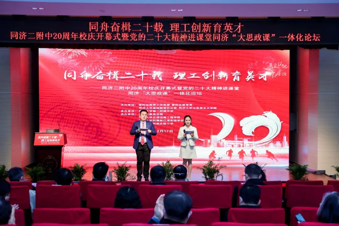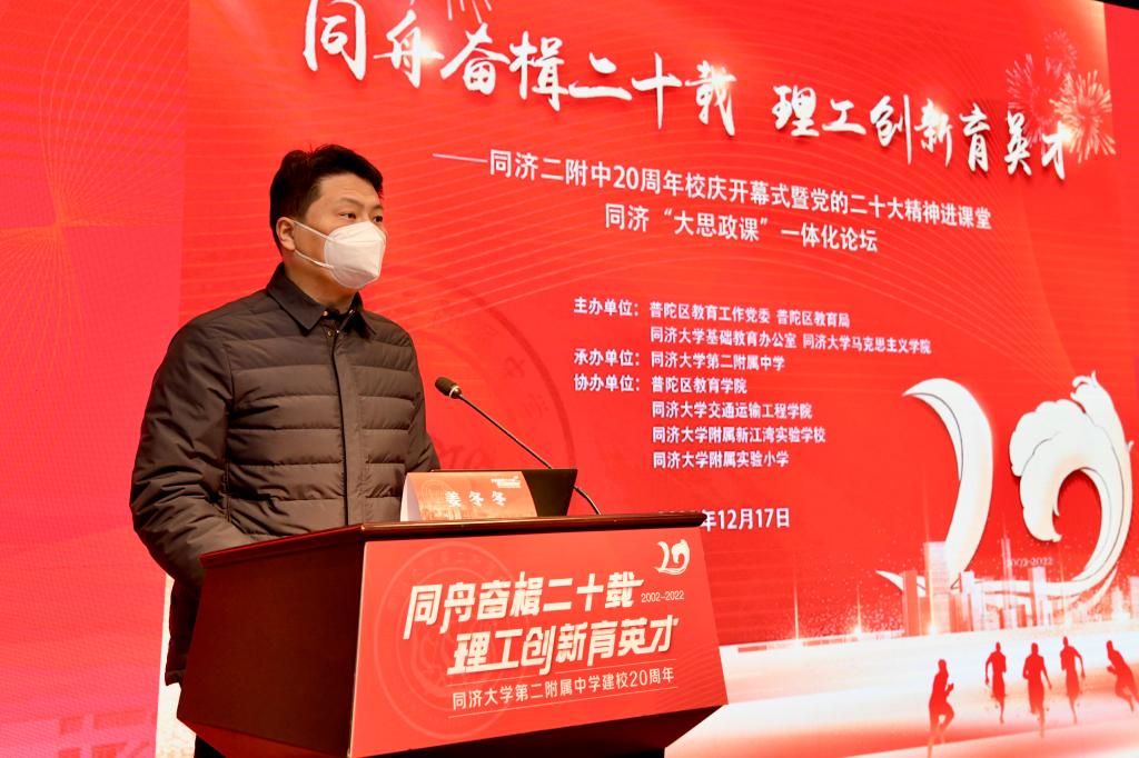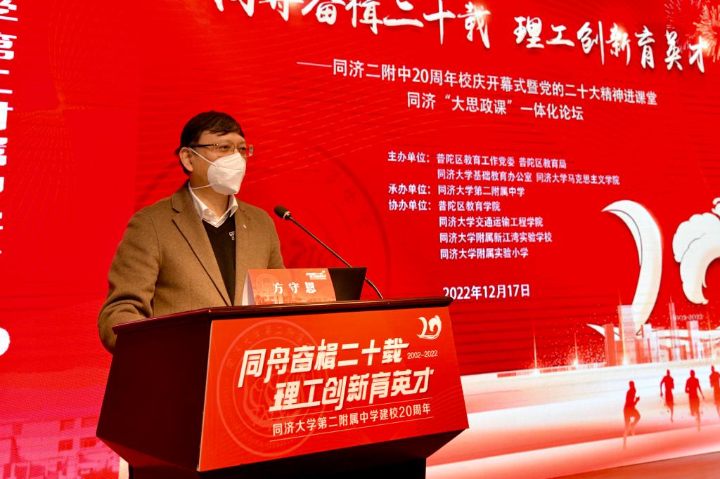 12月17日,党的二十大精神进课堂开云kaiyun官方网站“大思政课”一体化论坛在开云kaiyun官方网站第二附属中学举行。开云kaiyun官方网站党委书记方守恩、普陀区区委书记姜冬冬出席并讲话。普陀区副区长王珏、市教委及区校相关部门负责人参加活动。论坛突出学习宣传贯彻党的二十大精神,以“解读中国式现代化,构建大思政课育人体系”为主题,普陀区各中小学、开云kaiyun官方网站各附属中小学思政课教师线上线下共同参与。论坛还拉开了开云kaiyun官方网站第二附属中学20周年校庆系列学术活动的帷幕。