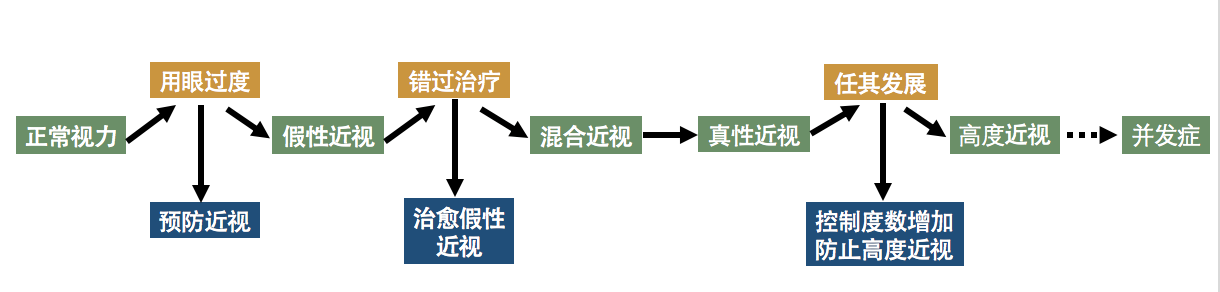 青少年近视发展的原因大多是由环境因素造成的。在疫情期间,青少年近处用眼的机会大大增加。我们看远看近是由眼部的“睫状肌”调节的,“睫状肌”像个弹簧一样,通过收缩或舒张来控制“晶状体”变凸或变扁,从而改变光线折射角度落在视网膜上,就和照相机的原理一样。尤其对于青少年而言,眼部仍处于发育状态,长期看近处物体,导致睫状肌一直处于收缩状态而麻痹,类似弹簧有点生锈,暂时失去弹性,就造成了假性近视。此时若不重视,把弹簧上的锈除掉,改变生活习惯,就会发展为真性近视,弹簧永久地失去了弹性,此时眼轴也会增长,发展为轴性近视与屈光性近视并存的混合型近视,此时近视就不可逆了。因此,疫情期间,家长应该对孩子使用电子产品加以监督与良性诱导。原本不近视的孩子,一旦出现视物不清、模糊时,应给孩子眼部充分休息,或做好防护措施,前去医院散瞳验光。