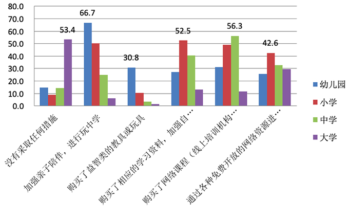 学生家长应对“停课不停学”的具体措施在不同学龄段之间有明显差异。调查数据显示,幼儿园、小学和中学阶段学生家长采取不同措施的比例都非常高,尤其是小学生的家长,采取的措施最多,未采取任何措施的比例只有8.8%,而大学阶段学生家长(包括大学生本人)未采取相应措施的比例高达53.4%。