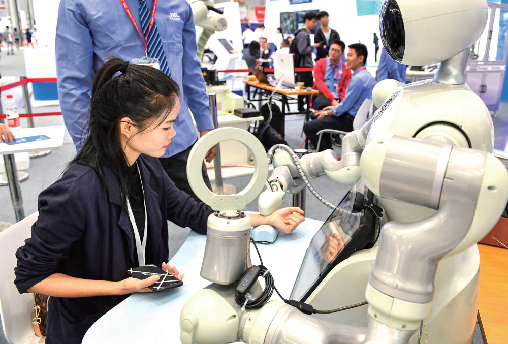 参观者在国际“互联网 +” 博览会上体验来自复旦大学智能机器人研究院的自主交互中医体检机器人(刘大伟/摄)