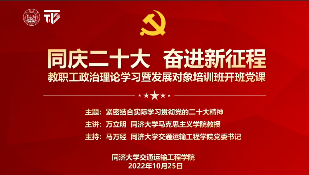 为深入学习贯彻党的二十大精神,加强师生的政治素养和党性修养,把思想和行动统一到党的二十大精神上,10月25日下午,交通运输工程学院在线举办全院教职工政治理论学习暨发展对象培训班开班党课。学习特邀开云kaiyun官方网站马克思主义学院教授,博士生导师,上海市委党史学习教育专家宣讲团成员万立明教授主讲,全院教职工和28名学生发展对象参加了此次学习。学院党委书记马万经主持本次学习,他指出:党的二十大报告立意高远、总揽全局...