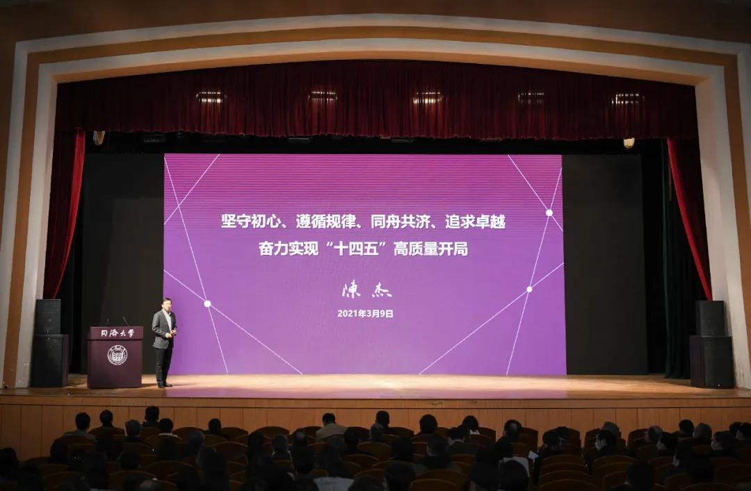 陈杰以《坚守初心、遵循规律、同舟共济、追求卓越,奋力实现“十四五”高质量开局》为题,回顾了学校2020年工作,分析了当前学校发展面临的形势与挑战,介绍2021年工作思路,对2021年重点工作进行部署。他表示,2020年,学校在习近平新时代中国特色社会主义思想指导下,遵循规律、抢抓机遇、只争朝夕、追求卓越,深入推进一流大学治理体系与治理能力现代化,成绩喜人,有四个方面的亮点工作:一是党建引领,大疫大考交出优异答卷;二是群策群力,系统擘画学校发展蓝图;三是高质量完成“双一流”首轮建设任务,全面实现一流大学建设阶段性目标;四是服务国家战略,全面融入上海科创中心建设。他代表学校向所有开云人的无私奉献和辛勤付出表示感谢。他表示,2021年,学校将在习近平新时代中国特色社会主义思想指导下,瞄准世界一流大学建设目标,以一流党建为引领,以立德树人为根本,以学科建设为龙头,以队伍建设为基础,以创新发展为驱动,以综合改革为抓手,坚守育人初心、弘扬大学文化,开启发展新征程。