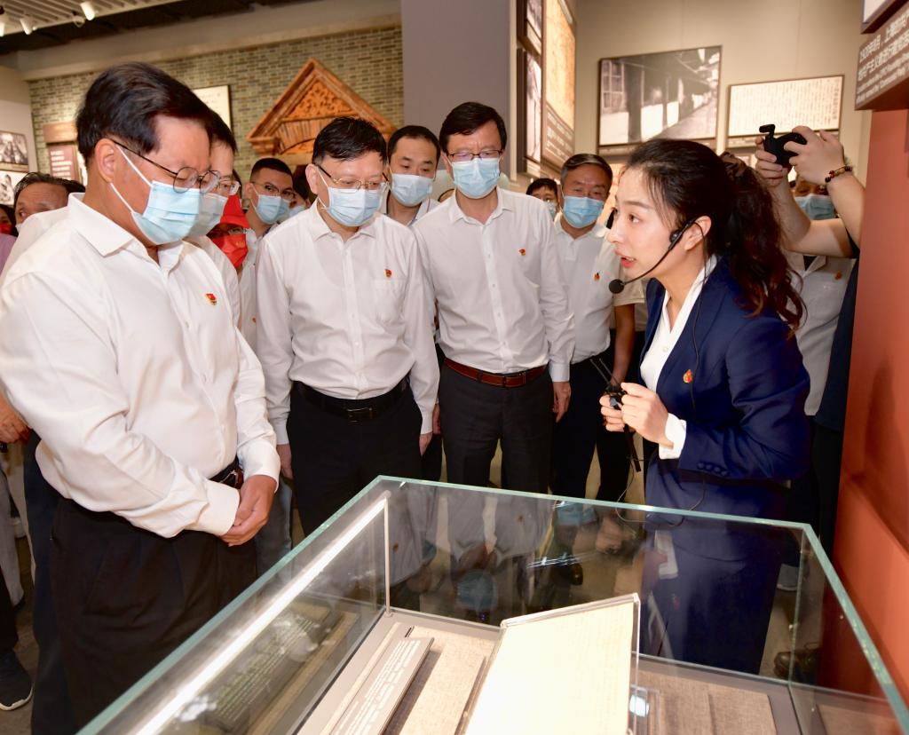 纪念馆内,党旗飘扬,参观者络绎不绝,洋溢着一派喜迎建党百年的氛围。朱崇实、方守恩、陈杰一行先后步入“伟大的开端——中国共产党创建历史陈列”展览的序厅、第一部分“前仆后继 救亡图存”、第二部分“民众觉醒 主义抉择”、第三部分“早期组织 星火初燃”、第四部分“开天辟地 日出东方”、第五部分“砥砺前行 光辉历程”的展厅和尾厅,认真听取讲解员的讲解,在一张张珍贵的历史文献和图片、一件件红色文物展品、一尊尊历史人物雕塑、一处处逼真的复原场景前驻足细看,全方位、立体式学习回首党的诞生发展历程和艰苦卓绝、波澜壮阔的百年风云,真切感悟百年大党的初心使命。一枚枚党徽在胸前熠熠闪光。