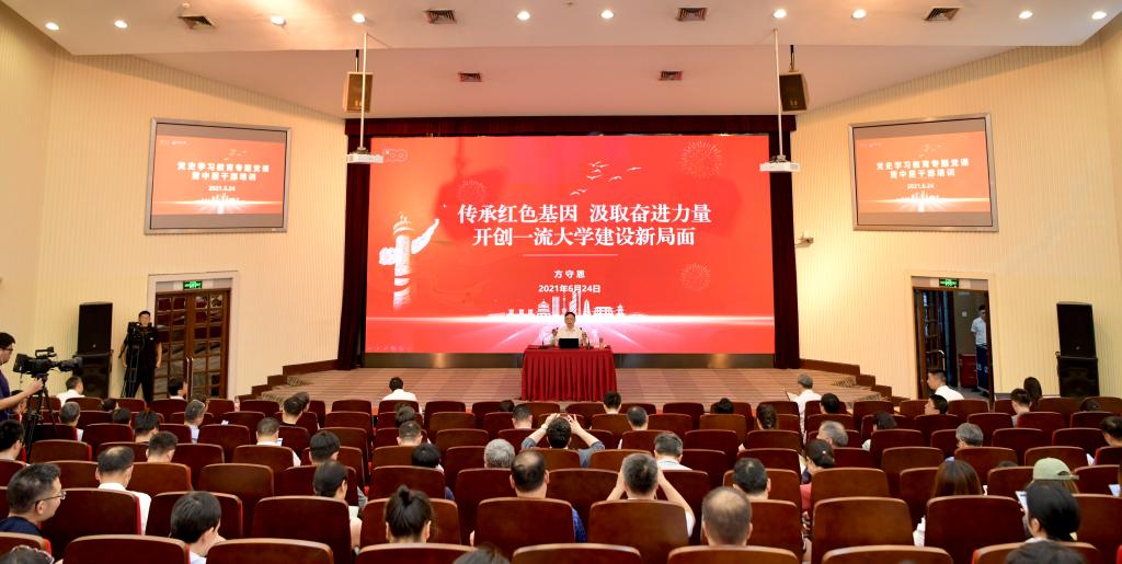 在讲到中国特色社会主义新时代党的历史时,方守恩指出,党的十八大以来,学校以习近平新时代中国特色社会主义思想为指导,认真学习贯彻习近平总书记关于教育的重要论述,牢牢把握社会主义办学方向,紧紧围绕立德树人根本任务,推进学校综合改革,学校的综合实力取得了显著进步,国际国内知名度和学术声誉显著提升,向着中国特色世界一流大学的建设目标迈出坚实的步伐。他从8个方面阐述了学校贯彻党的教育方针和习近平总书记关于教育的重要论述所取得的成绩。