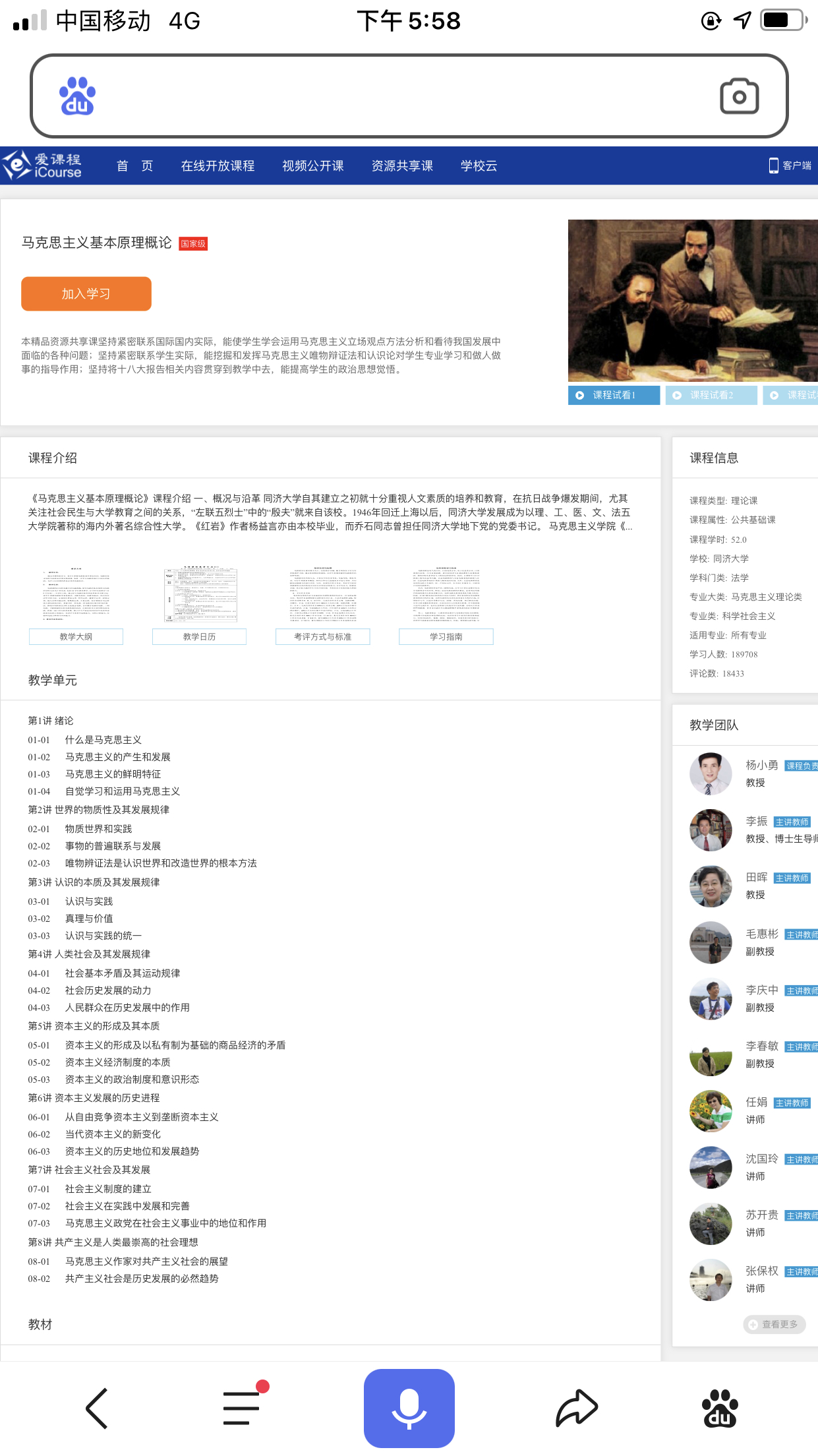 “我们在发挥‘马克思主义基本原理概论’这门课应有的思政教育、思想引领功能的同时,还引导学生学以致用。”主讲教师杨小勇教授说,学生来自不同学院、不同专业,力求将这门课程与同学们的专业实验、专业实习、专业设计紧密结合。同学们普遍反映:“没想到,学习马克思主义唯物辩证法和认识论对我们的专业学习也有这么大的指导作用。”这门课程2016年入选教育部首批“国家级精品资源共享课”。截至2021年3月18日上午,该课程在线学习人数达到189708人,居全国该门课程在线学习人数首位。