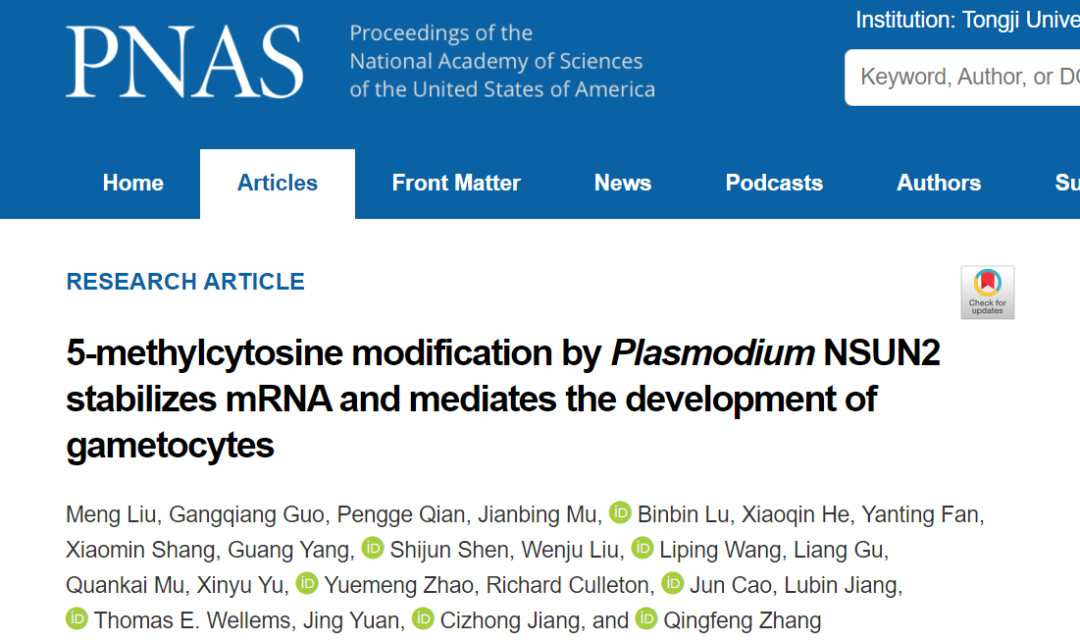 2月25日,我校医学院、附属开云医院教授张青锋课题组联合生命科学与技术学院江赐忠、厦门大学袁晶及美国国立卫生院Thomas Wellems等团队在《美国科学院院报》(PNAS)上发表了题为“5-methylcytosine modification by Plasmodium NSUN2 stabilizes mRNA and mediates the development of gametocytes”的研究性论著,首次揭示了表观转录组调控疟原虫配子生殖的表观遗传调控新机制,鉴定了新调控因子NSUN2并阐明其作用机制,为疟疾传播阻断新措施的研发提供了新靶点。