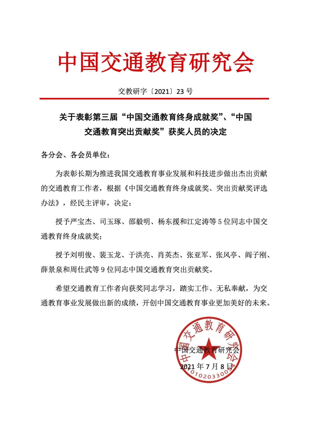 7月8日,中国交通教育研究会授予我校交通运输工程学院杨东援教授“中国交通教育终身成就奖”,以表彰其长期为推进我国交通教育事业发展和科技进步作出的杰出贡献。