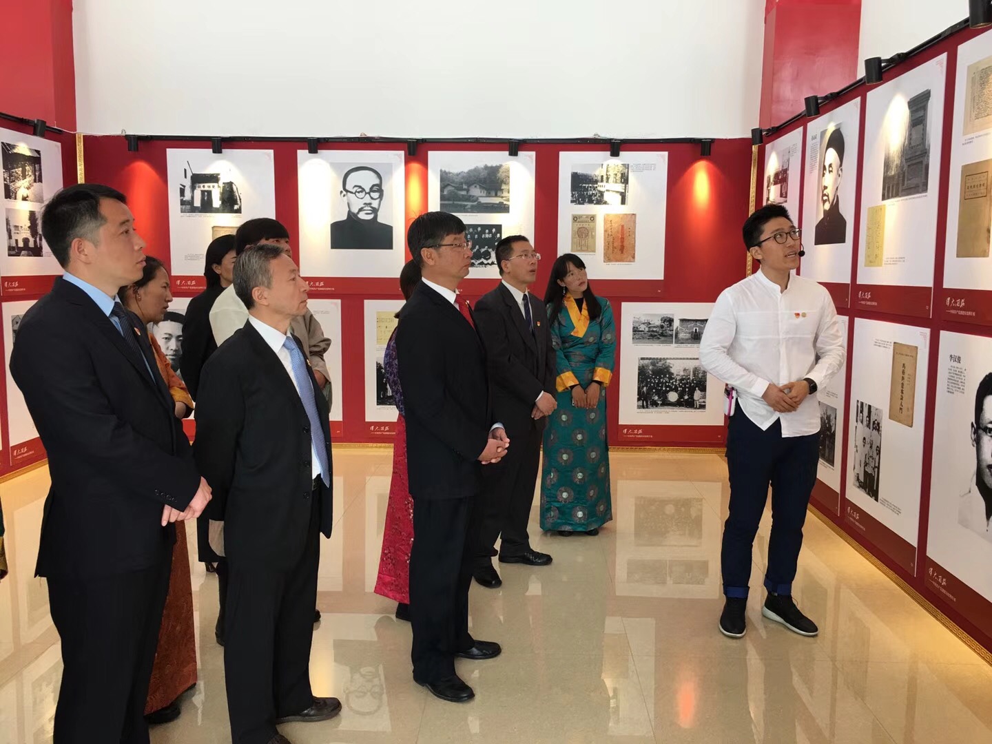 张桁嘉(右一)为西藏农牧学院师生讲解“伟大开端”中国共产党创建史图片展