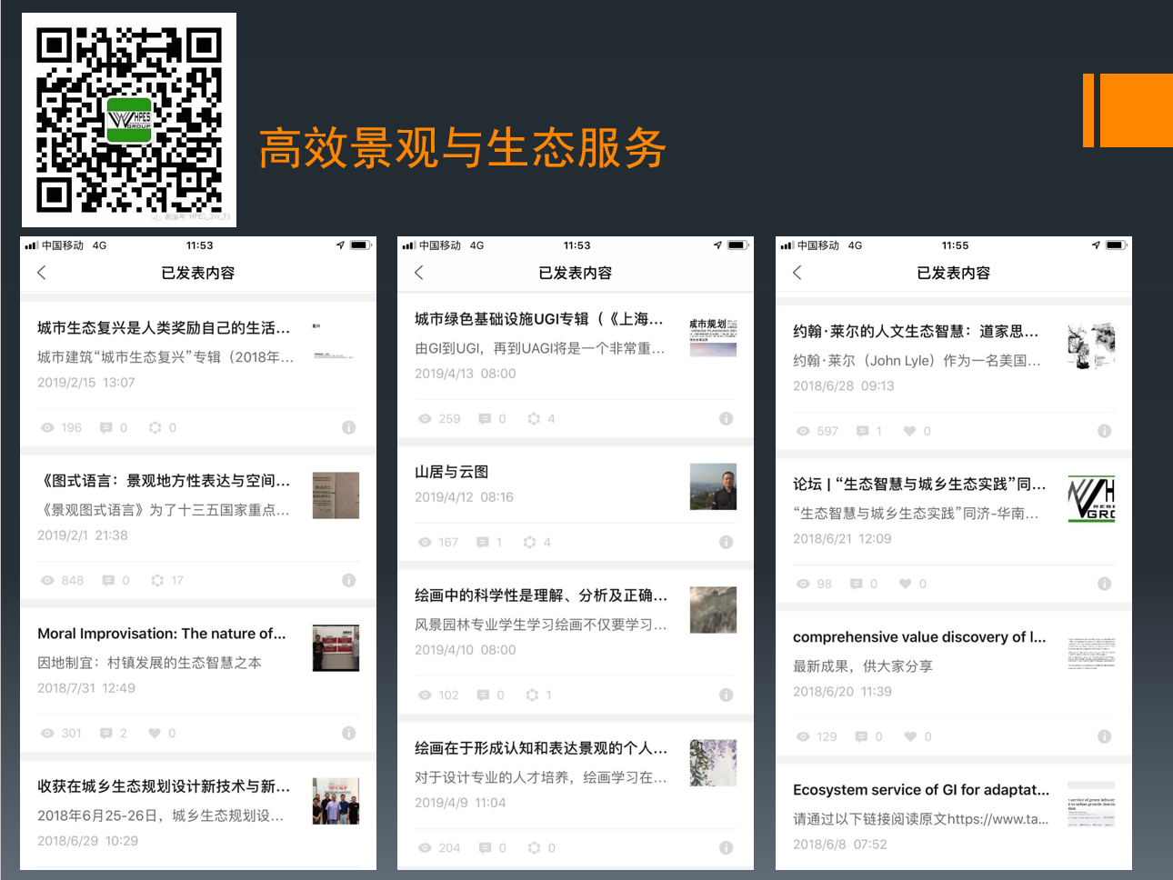 课堂上注重理论讨论、观点辩论与案例剖析,选用“十二五”国家级规划教材《景观生态规划原理》、“十三五”国家重点图书《景观与区域生态规划方法》《图式语言——景观地方性表达与空间逻辑的新范式》。课后,课程链团队的老师们还建立了“高效景观与生态服务”微信公众号,供学生们进行线下学习。