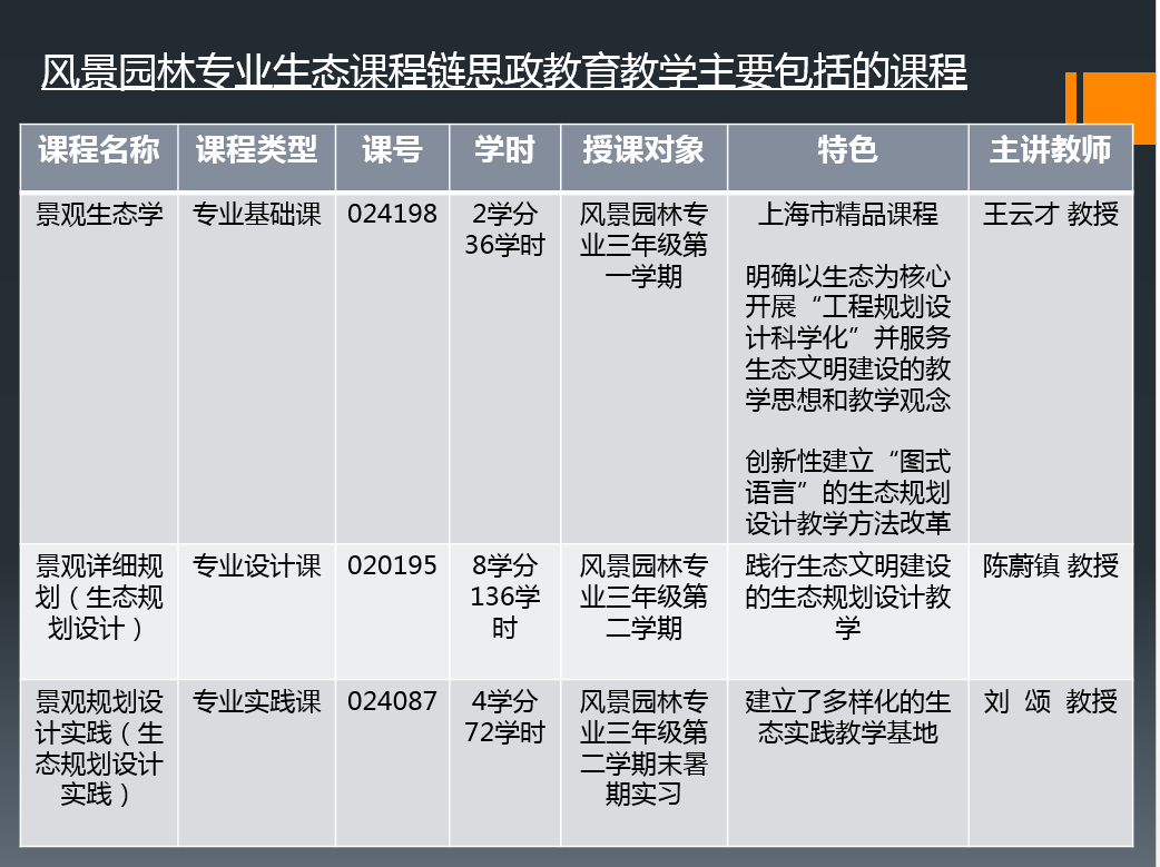 自2018年起,我校建筑与城市规划学院在风景园林专业本科人才培养中,将“绿水青山就是金山银山”这一重要理念与生态文明建设内容融入到教学全过程,创新设计了生态文明思政课程链。其中《景观生态学》入选上海市高校课程思政教育教学改革试点课程、上海市课程思政领航课程、上海市精品课程,最近,更是入选《上海高校课程思政教学设计案例》。课程链团队是如何将思政教育融于专业课程,达到入脑、入心效果的呢?