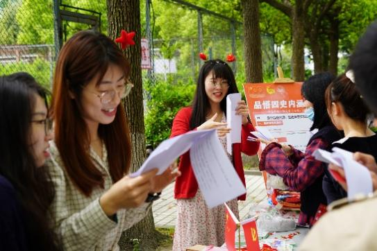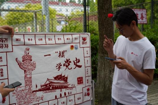 党史故事连连看、一“棋”学党史、红色地图版“大富翁”……4月20日中午,在我校四平路校区、嘉定校区,学生们搭起百米红色市集,摆开摊位,通过游戏互动,让党史学习“活”起来。