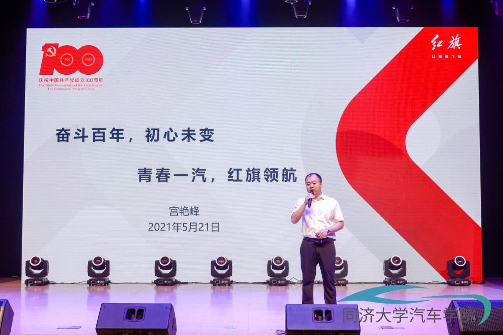 晚会上,6位汽车企业优秀青年代表和2位汽车学院青年教师作主题演讲。一汽集团研发总院动力总成部宫艳峰以《奋斗百年,初心未变青春一汽,红旗领航》为题,介绍了一汽经典品牌——红旗的改革与创新故事,鼓励青年大学生加强培养个人能力和意识,不断提升自我。东风汽车集团有限公司陈虹吉以《百年大党,风华正茂;半百东风,仍是少年》为题,讲述了东风汽车建厂初期的艰辛和抗疫中“最飒逆行车”的故事,展现了东风人不屈不挠的“马灯精神”。重庆长安汽车股份有限公司王金汶以《百年复兴路,世纪长安颂》为题,讲述了长安汽车在党旗下实业兴邦、千里西行、结缘汽车、自立自强,不断发展的故事。北汽蓝谷麦格纳汽车有限公司赵鹏以《两个奋斗者伙伴,一部世界级好车》为题,讲述了北汽党委如何把方向、管大局、保落实,积极促进企业发展的历程,并介绍了北汽与华为合作研发无人驾驶系统的情况。上汽乘用车公司霍飞蛟以《建筑·汽车·跨界》为题,介绍了上汽“R”汽车将中华传统文化融入现代汽车设计美学的故事。吉利汽车研究院有限公司张晓龙以《极氪出发,御风前行》为题,分享了吉利新款车型极氪001中的研发故事。来自汽车学院的青年教师代表冷搏及蔡黎明分别作了题为《一颗初心 一纪同行》和《中国梦 汽车魂》的主题演讲。冷搏分享了他在开云汽车求学、工作十二载的所思所悟。蔡黎明讲述了他从汽车学院本科毕业海外留学后再返校任教、培育汽车人才的故事。