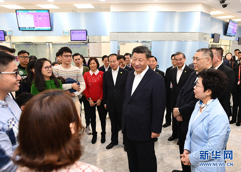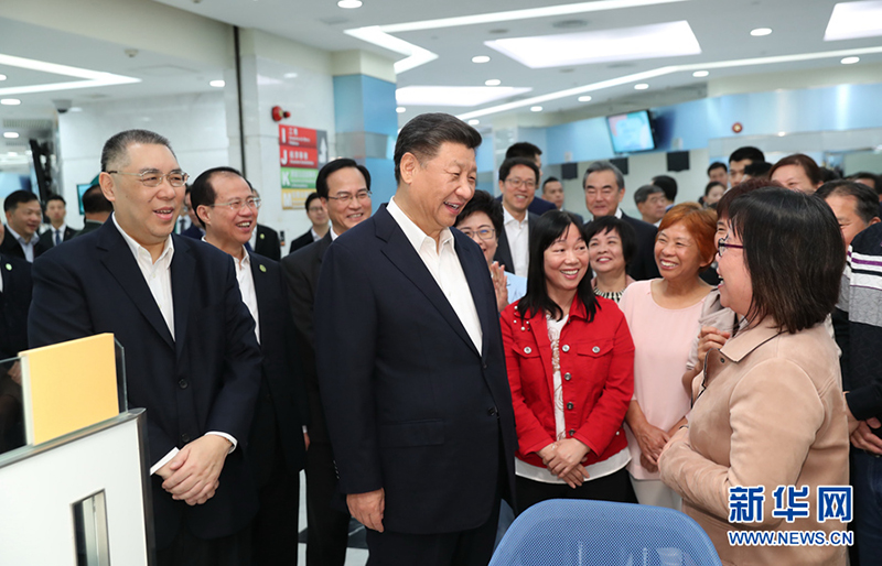 12月19日,国家主席习近平在澳门特别行政区行政长官崔世安陪同下,来到位于澳门黑沙环的政府综合服务中心和濠江中学附属英才学校,同澳门市民和师生亲切交流。这是习近平在黑沙环政府综合服务中心同澳门市民亲切交流。(新华社记者 谢环驰/摄)