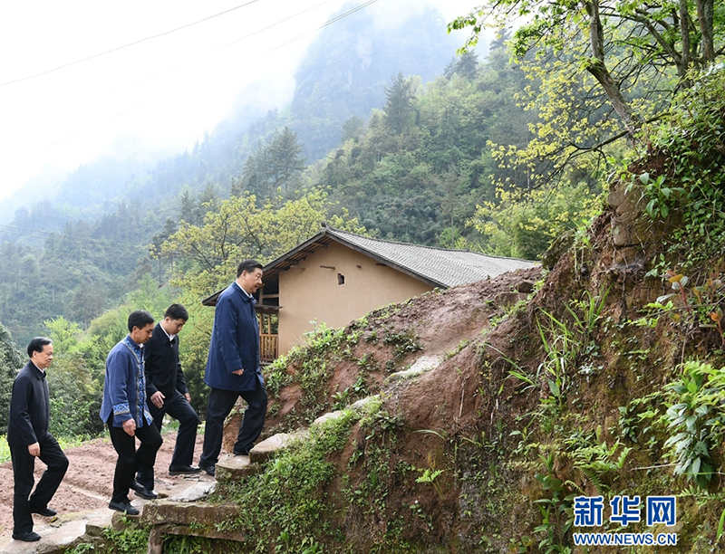 这是4月15日下午,在石柱土家族自治县中益乡华溪村,习近平踏着湿滑的石阶登上陡坡,前往贫困户谭登周家看望。(新华社记者 谢环驰/摄)