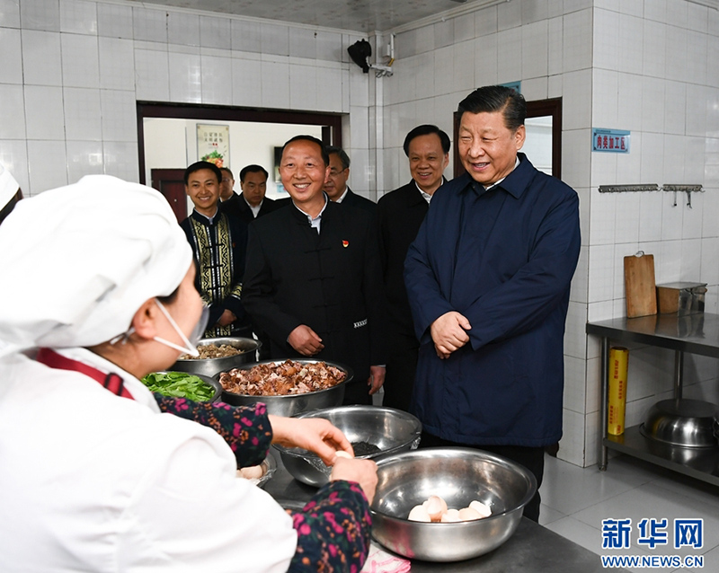 这是4月15日下午,习近平在石柱土家族自治县中益乡小学走进师生食堂,了解贫困学生餐费补贴和食品安全卫生情况。(新华社记者 谢环驰/摄)