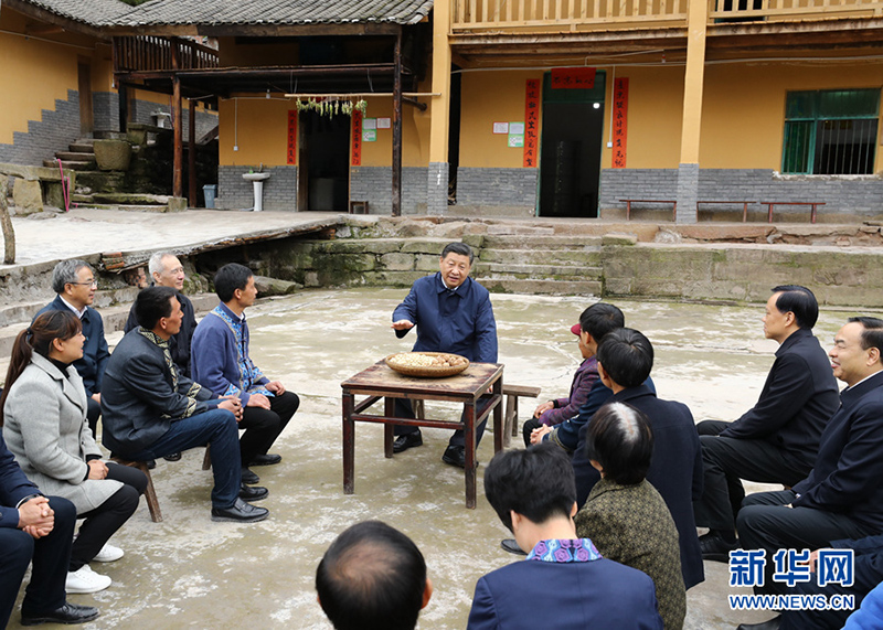 这是4月15日下午,习近平在石柱土家族自治县中益乡华溪村同村民代表、基层干部、扶贫干部、乡村医生等围坐在一起,共话脱贫攻坚。(新华社记者 谢环驰/摄)