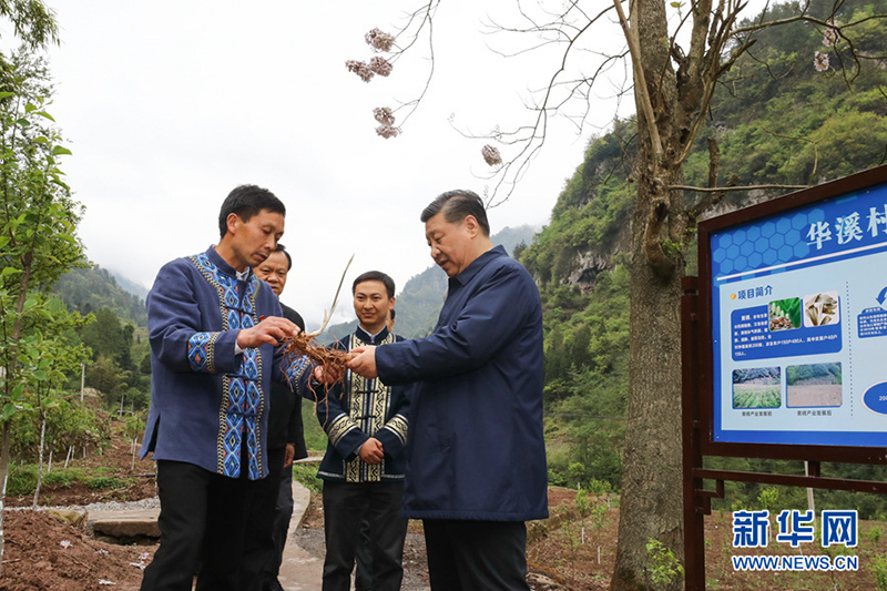 这是4月15日下午,习近平在石柱土家族自治县中益乡华溪村了解该村通过种植中药材黄精等特色经济作物带动村民脱贫的情况。(新华社记者 鞠鹏/摄)