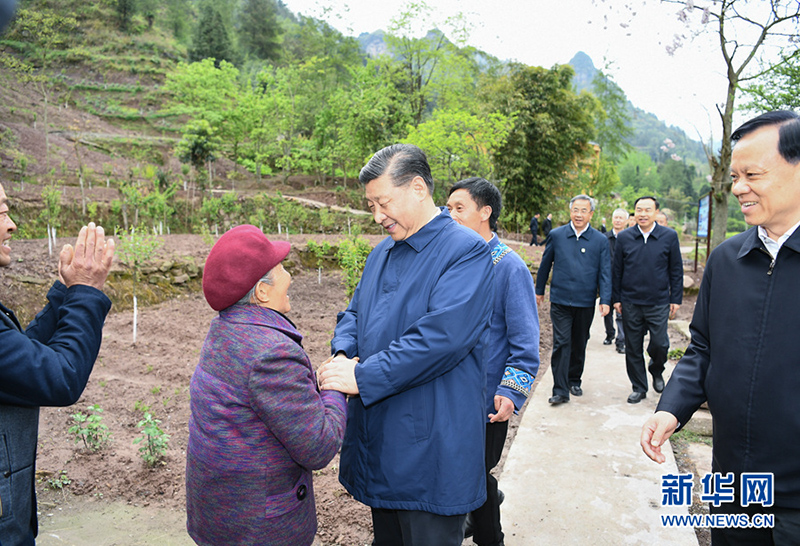 这是4月15日下午,习近平在石柱土家族自治县中益乡华溪村看望老党员、已脱贫户马培清一家。(新华社记者 谢环驰/摄)