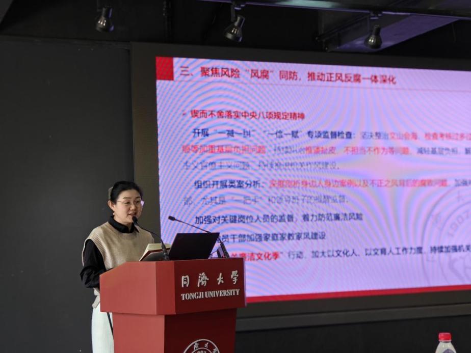 机关党委副书记徐婷婷就2025年机关纪委工作要点进行解读和工作部署。她指出,要加强政治监督,深化党纪学习教育,聚焦风险防控,实现预防和惩治腐败同步推进。要压实全面从严治党政治责任,加强规范化、法治化、正规化建设。她强调,今年将继续执行机关纪检委员责任清单制度,并开展机关廉洁文化季活动,通过“一减一纠”、“一俭一赋”等专项监督检查工作,进一步营造机关协同育人的良好氛围,推动学校事业的高质量发展。